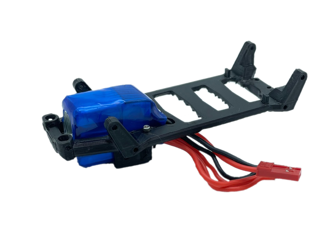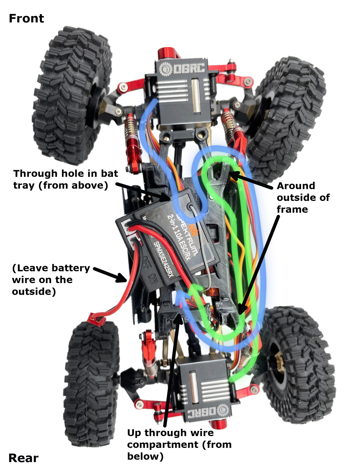 For aftermarket servos with longer wires, refer to the diagram below. Remove the battery to guide the wire through the tray then wrap the wires along and around the metal frame on the motor side to prevent flex issues.